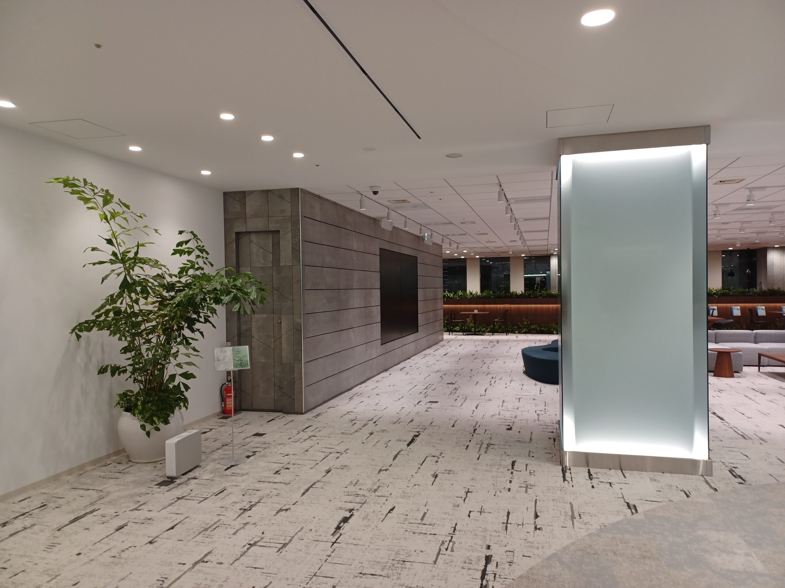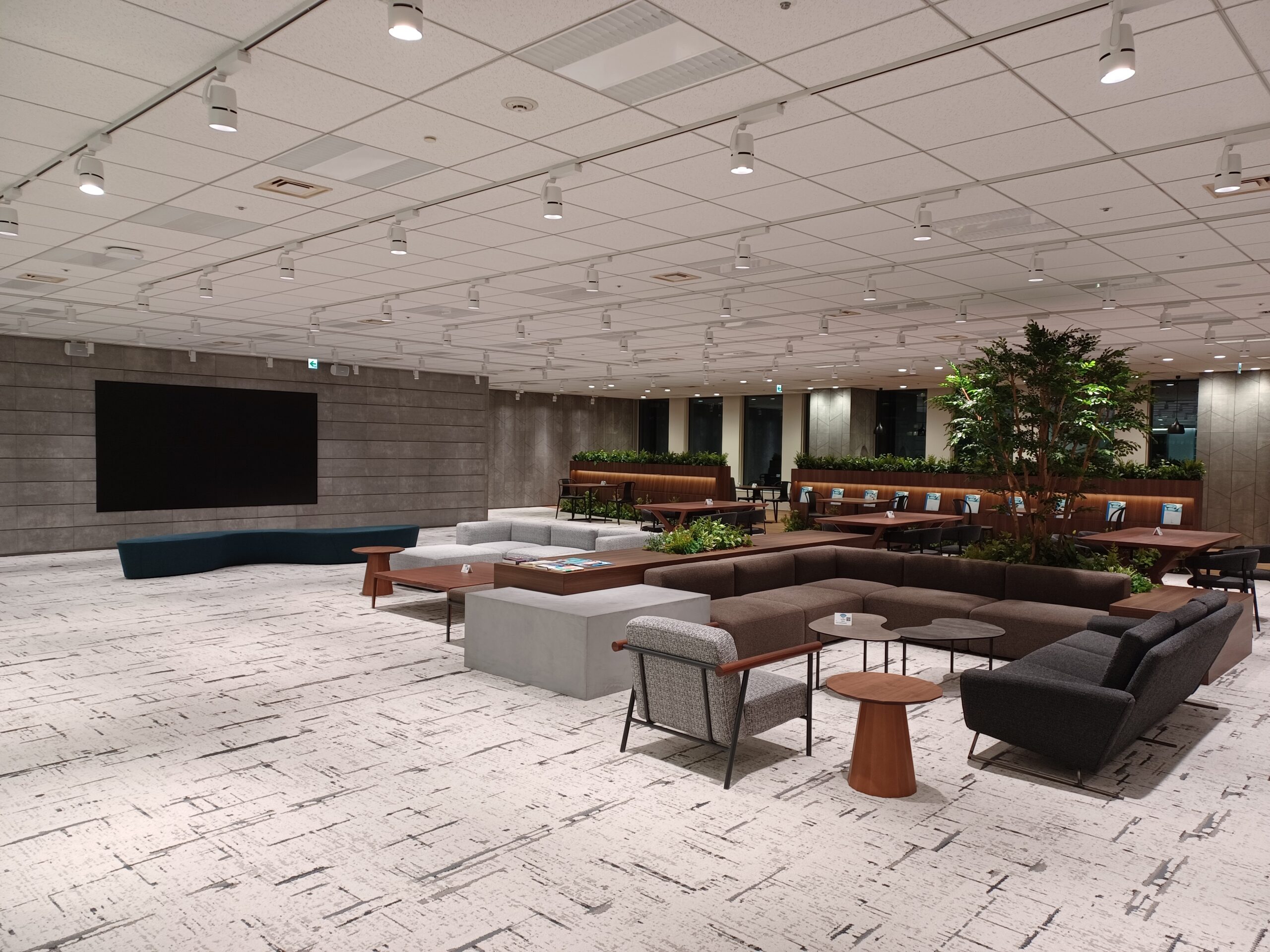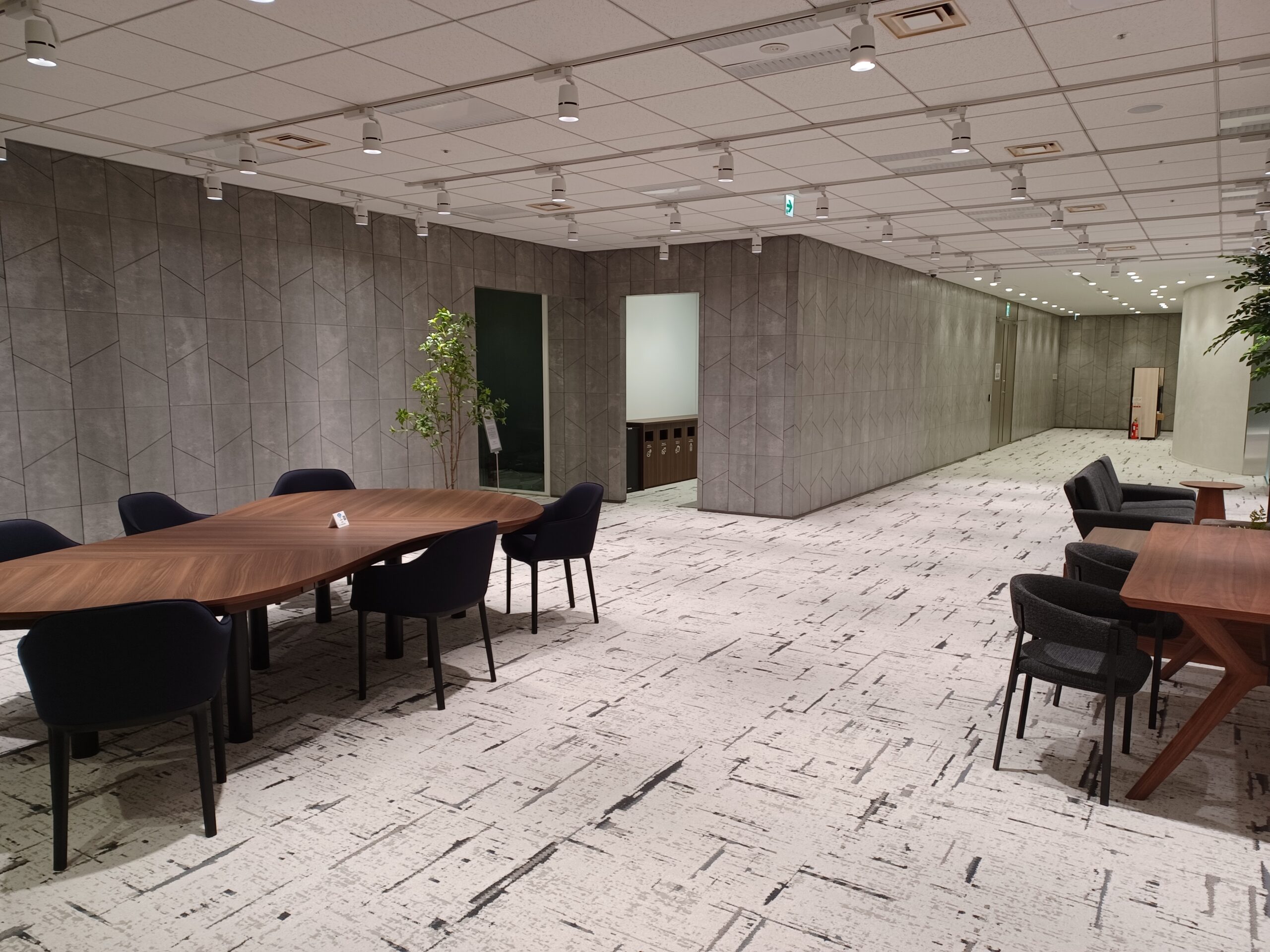 受付の向かい側には、来訪者が利用できるウェイティングエリアやコワーキングスペースも併設され、社外の方との“ナナメ”のつながりを生む場として機能しています。オフィス全体のテーマである、ヨコ・タテ・ナナメのつながりを体現する、新たな交流の可能性を広げる空間です。 - 苦労したところ
