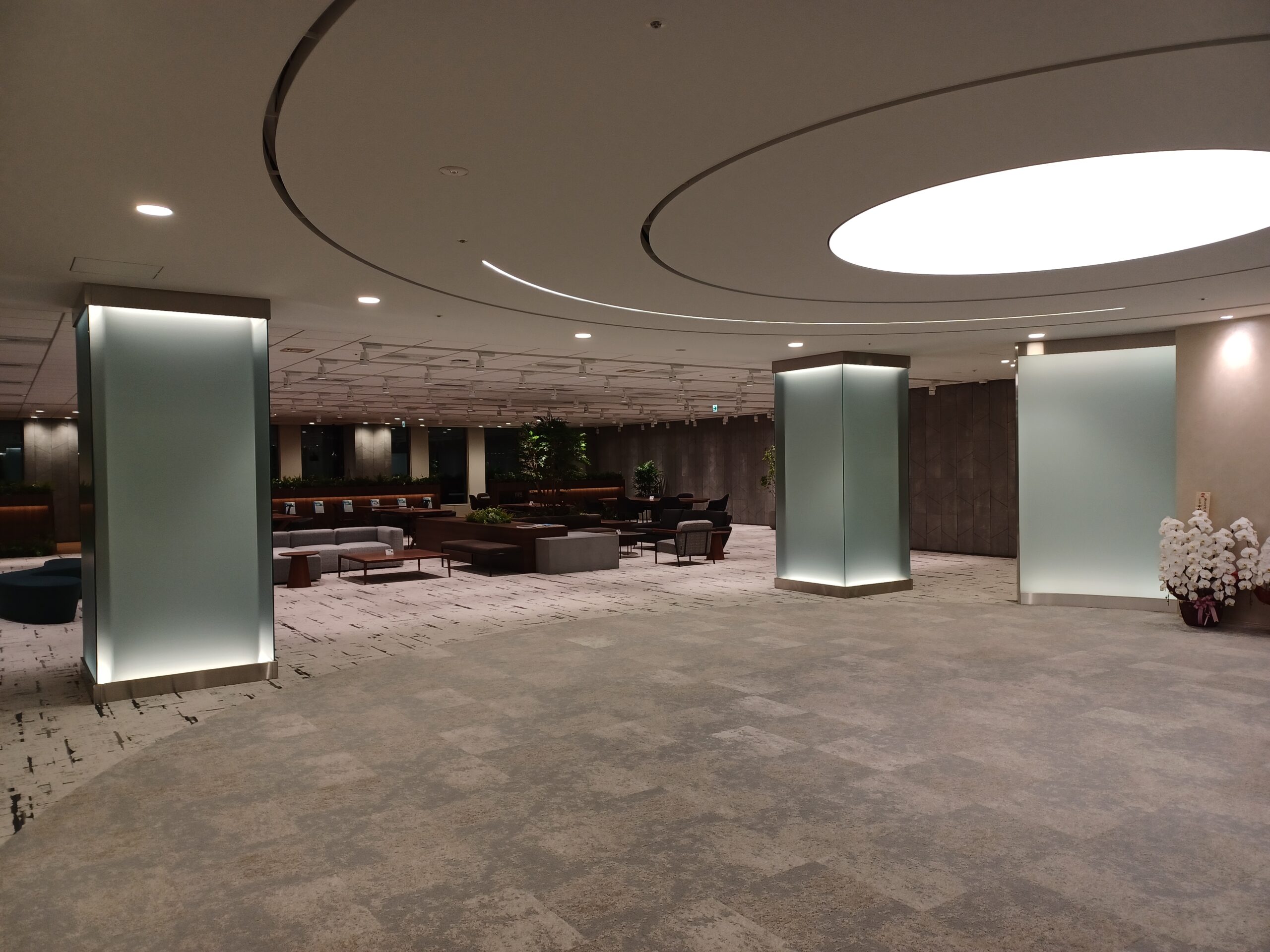 - 12階には来客機能を集約し、訪れる人を温かく迎える受付が設けられています。背面には、コーポレートカラーを基調とした青色のグラデーションが施され、企業の誠実さと親しみやすさを保ちつつ、洗練された印象を与える空間に。天井の円形のモチーフには、点と点がつながって線となり、最終的に円となるという意味が込められており、人と人とのつながりを象徴するデザインです。